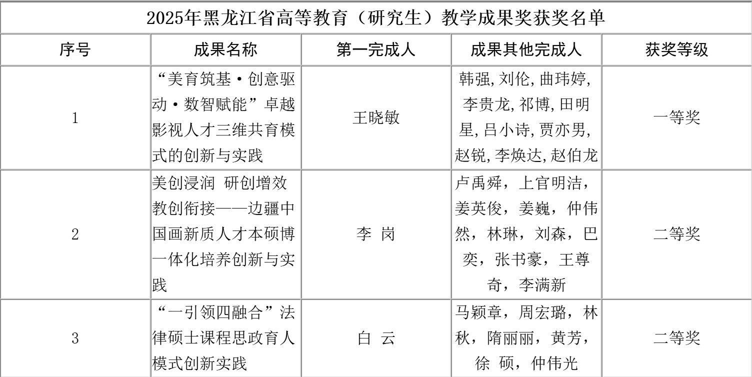 2026-03日前,省教育厅公布了2025年黑龙江省高等教育教学成果奖名单,授予高等教育(本科)教学成果奖282项,其中特等奖24项、一等奖103项、二等奖155项。我校在此次评选中表现优异,共荣获高等教育(本科)教学成果奖11项,其中特等奖1项、一等奖6项、二等奖4项。长期以来,学校始终将教育教学改革作为提升办学水平、培养创新人才的核心动力,高度重视教学成果的凝练与推广。本次获奖成果充分彰显了我校在人才培养模式革新、课程体系优化、教学模式升级等方面的创新探索与卓越实践。学校将以此次获奖为契...