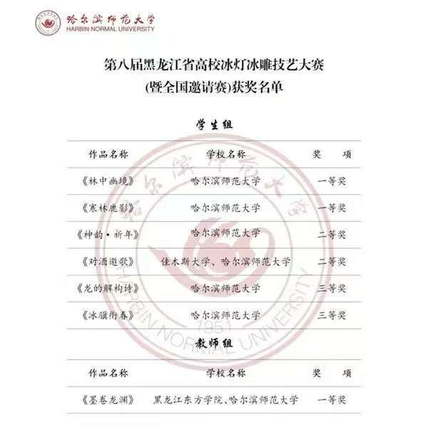 近日,黑龙江省2025-2026年度冰雪艺术系列赛事圆满落幕,我校师生团队踊跃参赛,斩获多个重要奖项。2025年12月23日,依托教育部中华优秀传统文化“冰灯冰雕制作技艺”基地(黑龙江大学),黑龙江省教育厅冰雪文化系列活动举办的第八届黑龙江省高校冰灯冰雕技艺大赛在大庆市萨尔图区兰德湖圆满落下帷幕。大赛汇聚全省19所高校的50支师生及行业导师队伍同台竞技。我校师生表现亮眼,学生作品《林中幽境》《寒林鹿影》斩获学生组一等奖,...