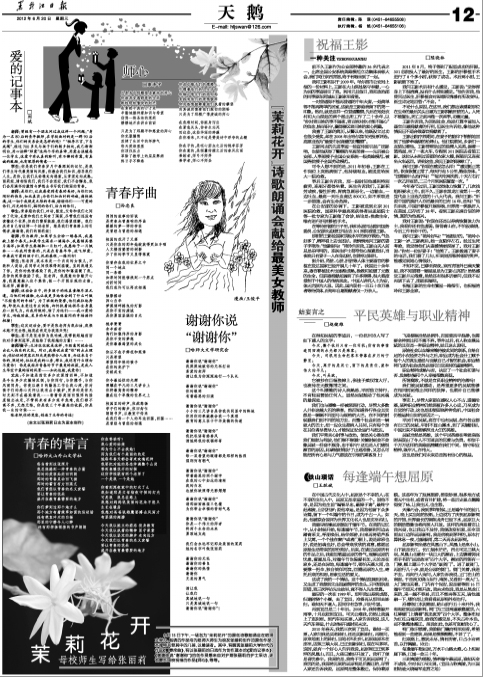 黑龙江日报:“茉莉花开”诗歌朗诵会献给最美女教师 黑龙江日报2012.06.20第12版 链接网址:http://epaper.hljnews.cn/hljrb/html/2012-06/20/content_842660.htm 茉莉花开---母校师生写给张丽莉 6月15日下午,一场名...