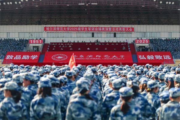 近日,在哈尔滨师范大学2025级学生军训会操表演暨总结表彰大会上,全体新生身着整齐的军训服,队列严整,目光炯炯,当国旗护卫队迈着铿锵有力的步伐护送三面国旗缓缓入场时,全场肃然起敬。在现场,学校党委副书记、工会主席郭砾为全体新生讲授“国旗下的思政课”,述说国旗背后动人心弦的故事。