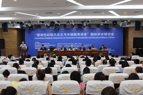 图1 会议开幕式现场 6月8日至9日,由我校教育科学学院、过程教育与哲学研究中心与美国中美后现代发展研究院、美国克莱蒙林肯大学共同主办的“建设性后现代主义与中国教育改革”国际学术研讨会在梦溪宾馆召开。