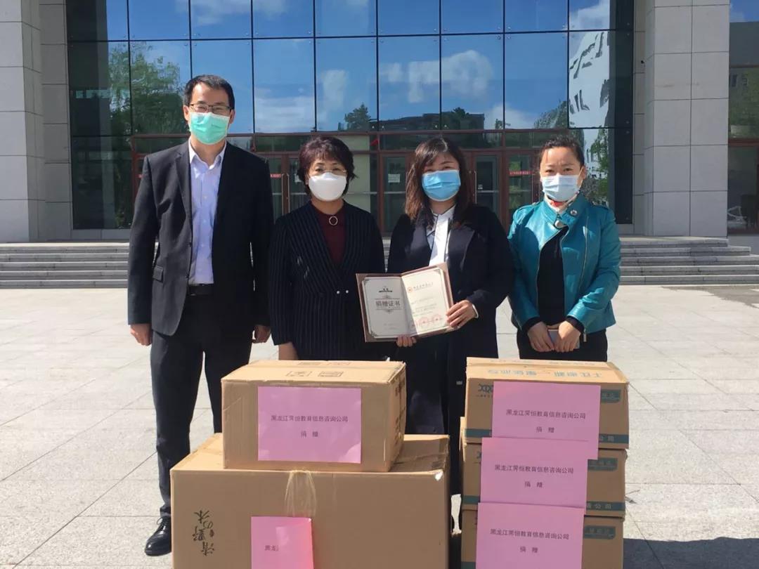 (庞春妍/文)5月12日上午,我校2008级校友薛淑敏代表黑龙江霁恒教育信息咨询公司向学校捐赠了一批防疫物资,包括一次性医用口罩3500只、医用洗手液80瓶、75度酒精湿巾120包。