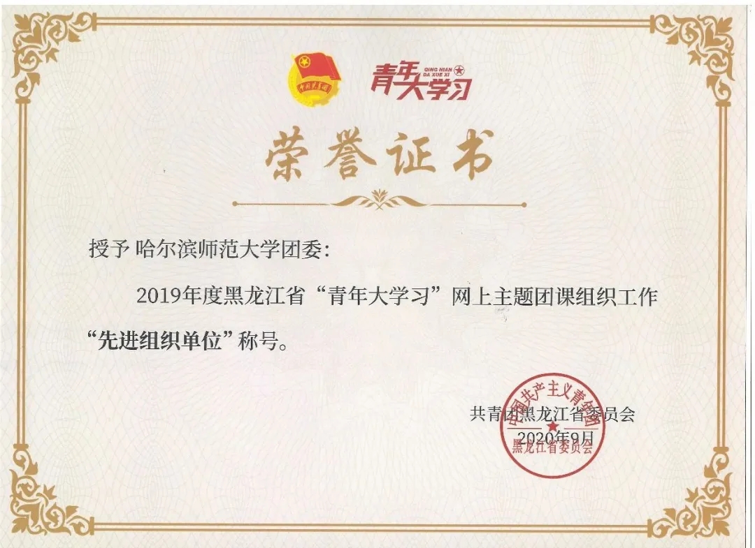 近日,共青团黑龙江省委员会下发了《关于表扬2019年度黑龙江省“青年大学习”网上主题团课组织工作先进个人、先进集体、先进组织单位的通报》。