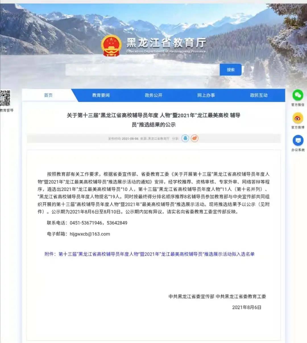 近日,由黑龙江省委宣传部、省委教育工委主办的第十三届“黑龙江省高校辅导员年度人物”暨2021年“龙江最美高校辅导员”推选结果公示,我校地理科学学院辅导员陈莹莹荣获2021年“龙江最美高校辅导员”荣誉称号;我校...