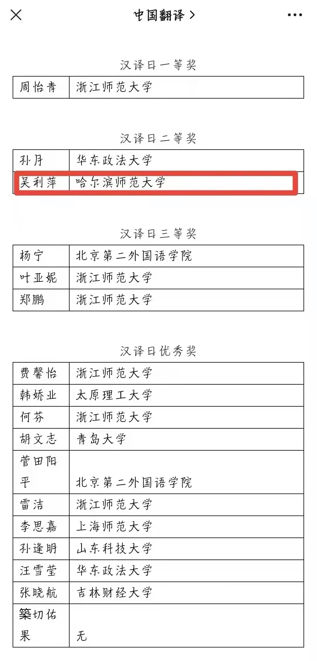 2021年10月21日,第三十三届韩素音国际翻译大赛获奖名单揭晓,我校2020级研究生吴利萍获大赛汉译日组二等奖。