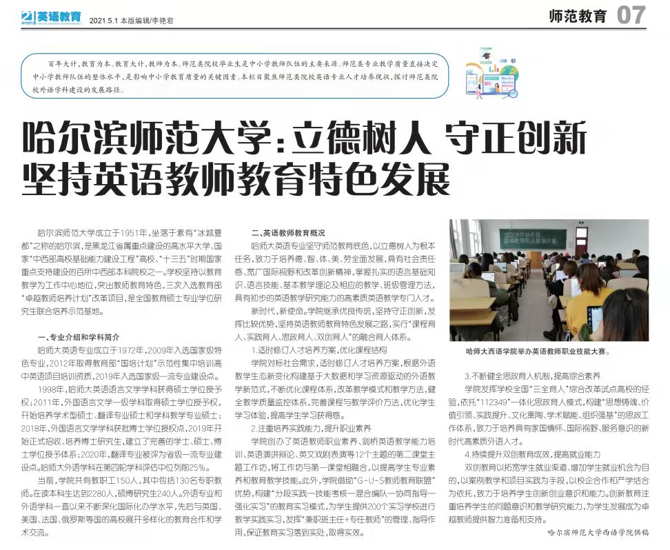 (徐伟伟/文)日前,《中国日报》旗下《21世纪报》刊登题为《立德树人,守正创新,坚持英语教师教育特色发展》文章,全面报道西语学院英语教师教育发展特色和成果。
