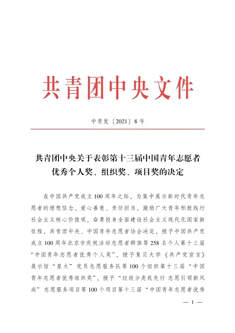 在第36个国际志愿者日来临之际,共青团中央、中国青年志愿者协会作出表彰决定,授予中国共产党成立100周年北京市庆祝活动志愿者群体等258名个人第十三届“中国青年志愿者优秀个人奖”,授予复旦大学《共产党宣言》展...