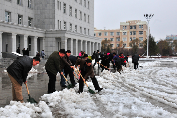 图 机关干部扫雪现场 11月11日晚,我市普降中到大雪,持续降雪给我校全体师生正常生活和教学带来极大的不便,严重影响学校师生的出行。