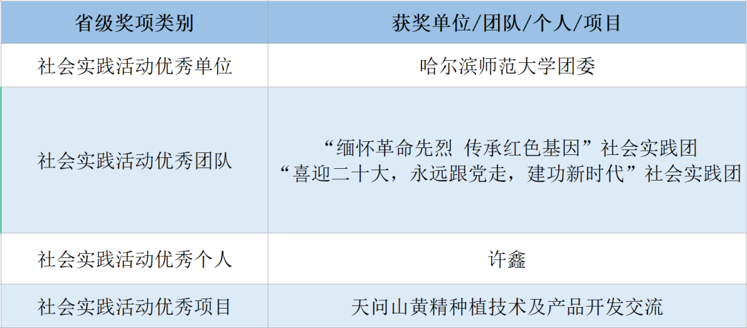 (韩雷/文)近日,根据团省委《关于做好2022年度黑龙江省大中专学生志愿者暑期文化科技卫生“三下乡”社会实践活动总结工作的通知》要求,经个人(团队)申报、学校推荐、资格审查、专家评审,我校在设立的四个类别评...