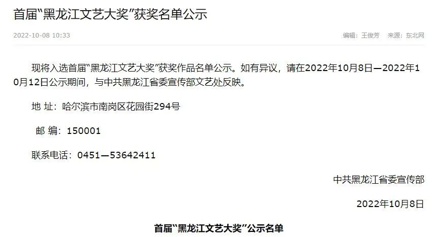 近日,中共黑龙江省委宣传部公示首届“黑龙江文艺大奖”获奖作品名单。