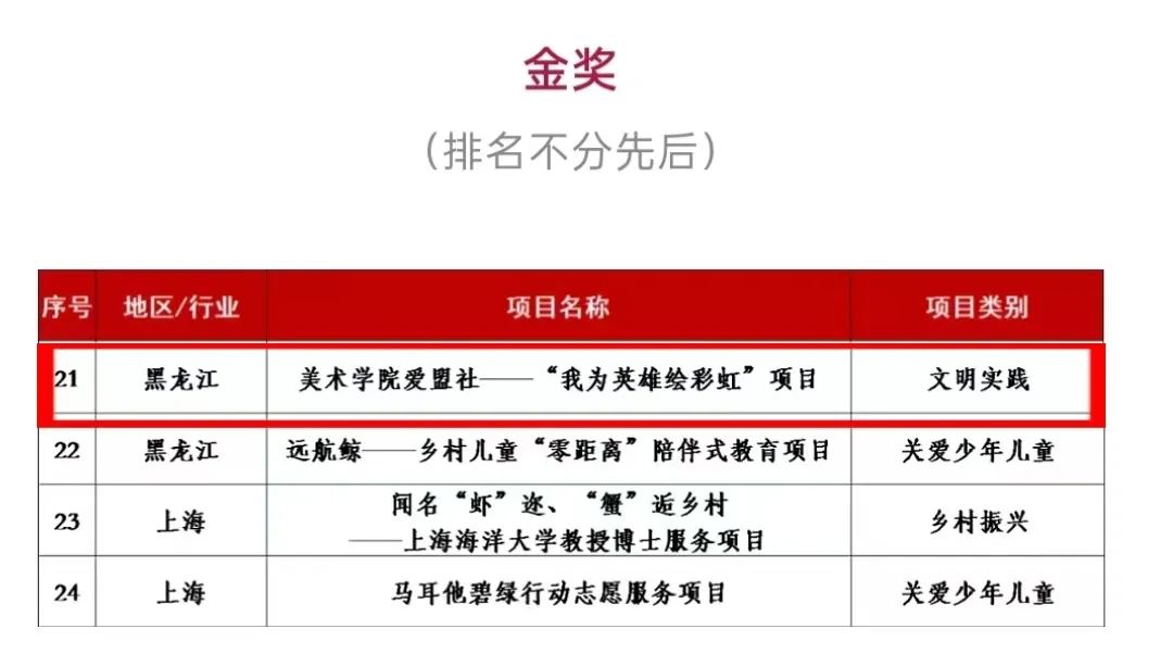(韩雷/文)近日,第六届中国青年志愿服务项目大赛全国赛获奖项目名单公示,经专家评审,我校志愿服务项目“美术学院爱盟社——我为英雄绘彩虹”荣获大赛金奖,“青春助梦,爱心公益教育平台”、“苔花学堂—助力乡村...