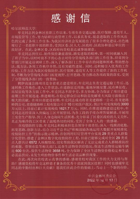 (李卓/文)12月19日,我校收到伊春市金林区发来的感谢信,对学校党委派遣国际美术学院副院长牟克教授挂职伊春市期间的辛勤付出表示充分肯定和高度赞扬。