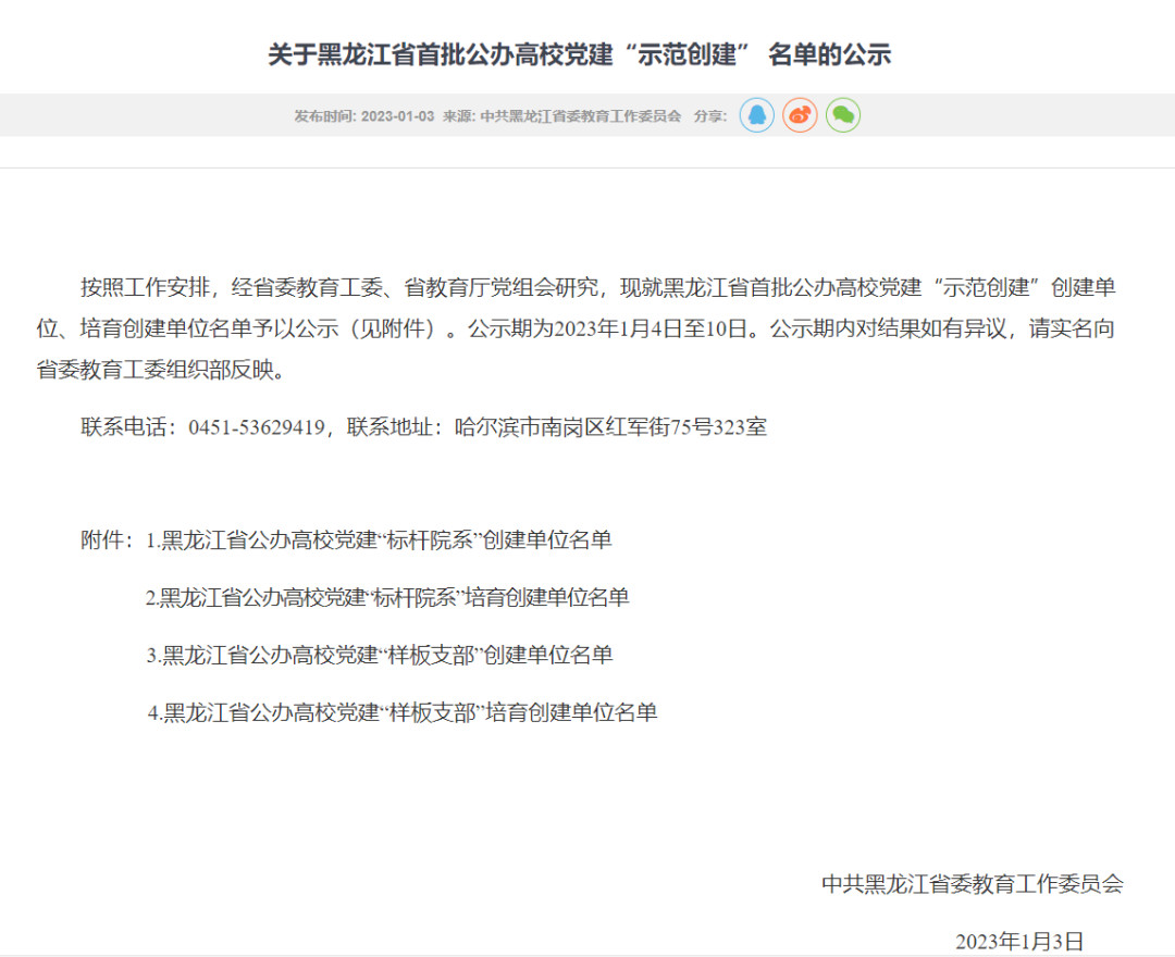 (刘岩冬/文)近日,省委教育工委发布了《关于黑龙江省首批公办高校党建“示范创建”名单的公示》,我校获批黑龙江省首批公办高校党建“示范创建”创建单位4个,获批数量为全省高校首位,并列第一。