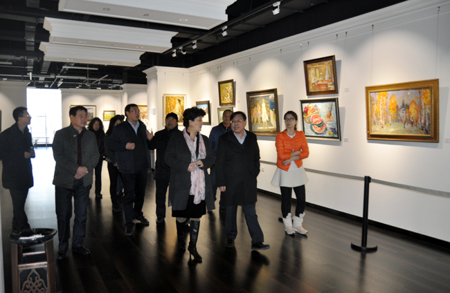 (李敏佳/文)3月18日上午,哈尔滨市副市长曲磊在市文新局局长张本沪等政府相关部门负责人陪同下来我校产业园区视察哈尔滨国际油画交易中心。