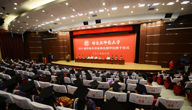 图 毕业典礼现场 (盛志伟/文)6月25日下午,我校在松北校区科学会堂隆重举行2015届毕业生毕业典礼暨学位授予仪式。