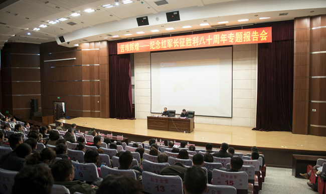 (盛志伟/文)为了传承弘扬伟大的长征精神,进一步推进“两学一做”学习教育深入开展,10月19日下午,校党委中心组(扩大)理论学习会暨纪念红军长征胜利八十周年专题报告会在我校江北校区科学会堂隆重举行。