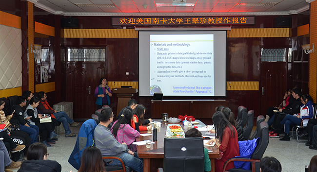 (解瑞峰/文)为更好地开展学术研究,扩大对外学术交流,3月10日下午,应地理科学学院邀请,美国南卡罗莱纳大学博士生导师王翠珍教授在黑龙江省普通高等学校地理环境遥感监测重点实验室报告厅为学院师生作了题为“Ho...