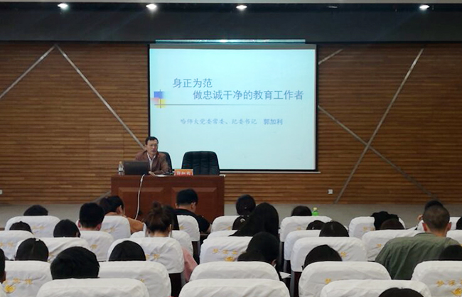 (戴旭楠/文)根据我校2017年新入职教师岗前培训工作的总体部署和具体要求,9月25日下午,党委常委、纪委书记郭加利为2017年新入职教师作了题为《身正为范,做忠诚干净的教育工作者》的讲座,教育科学学院、计算机科...