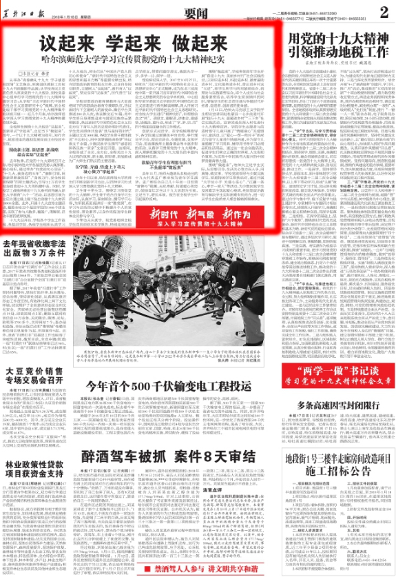 1月18日,黑龙江日报以“哈尔滨师范大学学习宣传贯彻党的十九大精神纪实:议起来学起来做起来”为题,报道我校学习宣传贯彻党的十九大精神系列活动。
