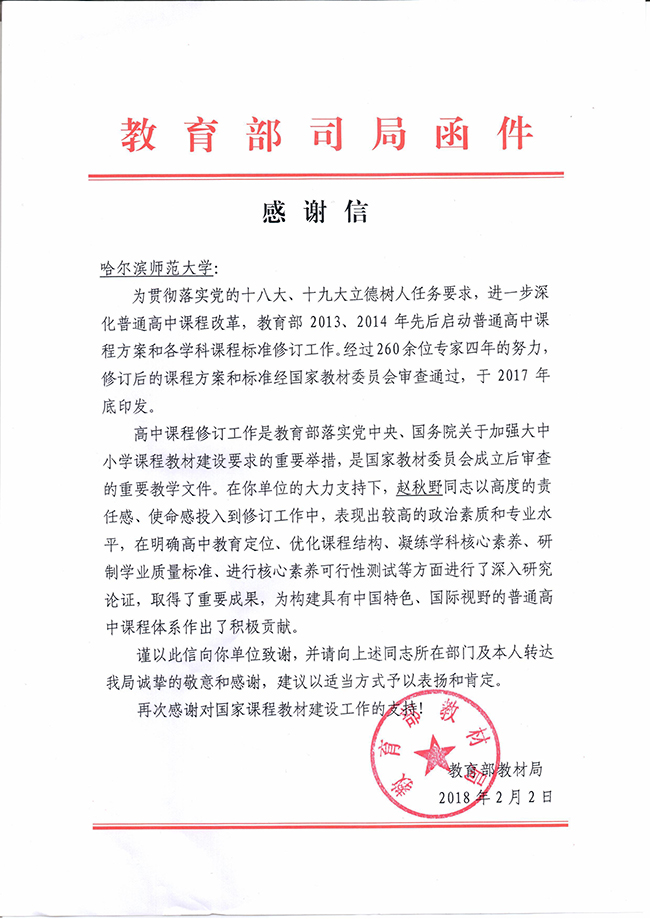 近日,我校喜获教育部教材局发来的感谢信,致谢我校斯拉夫语学院院长赵秋野教授为教育部修订《高中俄语课程标准》工作所做的贡献。