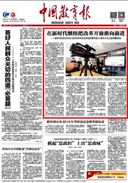 中国教育报2018年12月20日头版“在新时代继续把改革开放推向前进 ——高校书记校长热议习近平总书记在庆祝改革开放40周年大会上的重要讲话 ”中选择刊发了孙立军校长的表态发言。