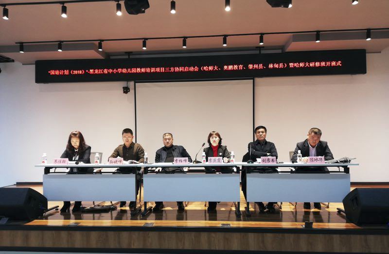 2月22日,“国培计划(2018)”——黑龙江省中小学幼儿园教师培训三方(哈师大、奥鹏教育、肇州、林甸)协同启动会暨哈师大研修班开班式在我校双创园召开。