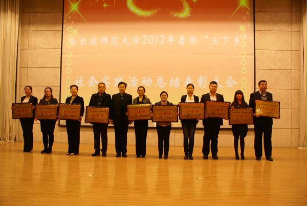 会上,经济学院副院长徐明教授代表暑期“三下乡”社会实践指导教师发言,政法学院孔晓冬代表社会实践队员发言。团委书记徐长勇宣读了《关于表彰哈尔滨师范大学2012年暑期“三下乡”社会实践活动的决定》,与会领导为获奖团队、优秀指导教师、先进个人进行颁奖。