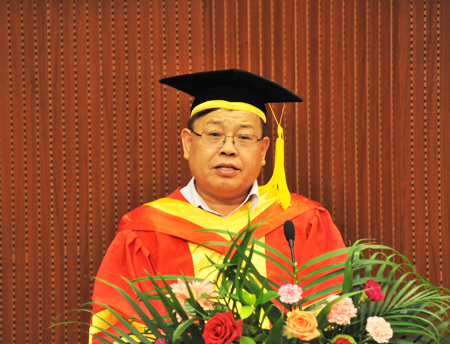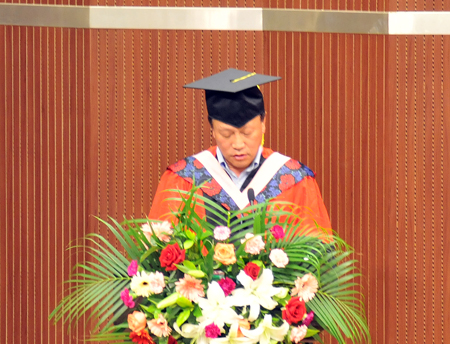 王选章在仪式上致辞,他向全体毕业生致以衷心的祝贺,并向获得学位的同学们致敬,同时向很好履行了教书育人职责的教师们、全力支持孩子完成学业的家长们致以诚挚问候。王选章指出,四载寒窗之苦,三年的潜心研究,为的是获得知识与本领,为的是追求科学与真理。同学们的收获是丰盈的,进步是巨大的,但学习无止境、成长需恒志,校门之外是更好的大学,是更广阔的人生舞台。检验真理,实践科学,奠基事业,实现理想才是真正的人生追求;胸怀理想,担当使命,回馈社会才是有志青年的应有作为。王选章希望,广大毕业生要诚实守信、与人为善,树立起人皆赞赏的职业操守、社会公德意识;要慎独守德、宁静淡泊、养成君子之风;要勇敢肩负起时代赋予的重任,忧以天下、乐以天下。王选章指出,母校将在同学们真诚的关注里,日益完善、不断发展,同学们也一定会在母校殷切的期望中有所建树、不断成长,为师延誉、为校增光,愿毕业生们带上母校的祝福、亲人的期盼,走进社会,开拓新的生活,创造新的辉煌。