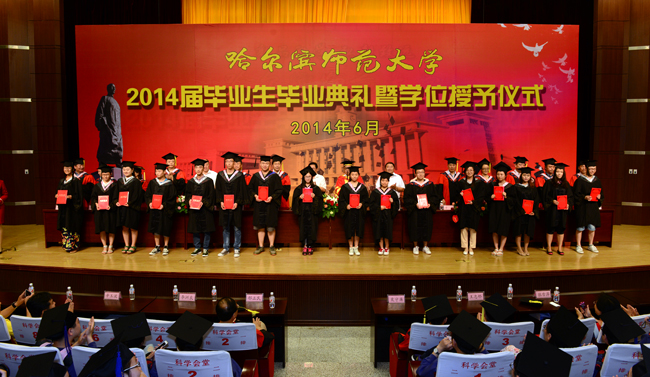 党委常委、副校长、校学位评定委员会副主席徐晓风宣布2014届本科毕业生,硕士研究生、博士研究生毕业生,获得学位名单;党委副书记王为正宣布获得我校2014届优秀本科毕业生、硕士毕业生名单;党委常委、副校长李凤飞宣布“福彩关爱行动”——哈尔滨师范大学应届毕业生到基层学校就业资助项目获奖名单。伴随着欢快而喜庆的乐曲,学校领导为获得学位的毕业生授予学位,为获得奖励的毕业生颁发荣誉证书,全场报以热烈的掌声。