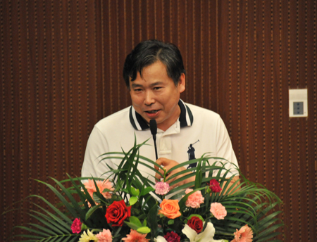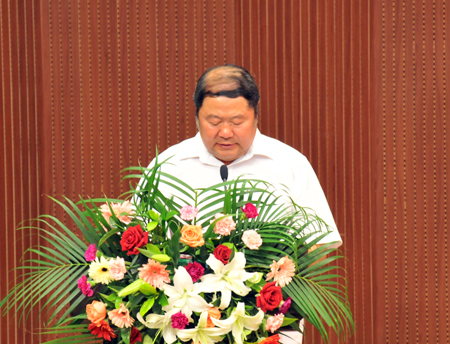 图 校友代表、我校88届化学系毕业生、翰皇集团总裁辛玉波在仪式上发言