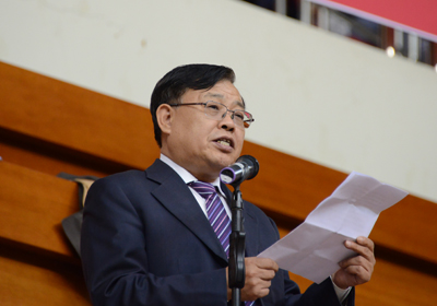 王选章在典礼上讲话。王选章代表学校向2014级新同学表示热烈的欢迎和衷心的祝贺。王选章指出,大学是人生的重要节点,同学们又重新站在了同一个起点线上,为即将独立进入社会做最重要的准备和历练。在这一过程中,同学们要明确学习目标, 适应大学学习方式,主动调整学习方法,要诚信友善、团结包容的与他人相处,严格自律、学会沟通。王选章希望同学们要责无旁贷的大力发扬永恒的道德精神、自觉地学术精神、敏锐的时代精神,践行“敦品励学、弘毅致远”的校训精神,做人类理想和社会良知的坚守者、引领者。