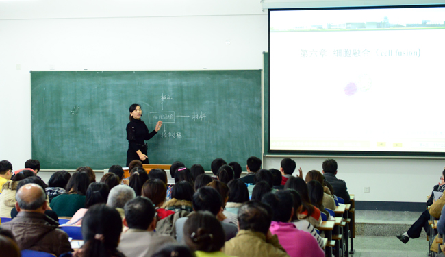 计晓春老师认为朱宏讲授的《细胞融合》课程思路缜密,逻辑性强,课程设计有思想。导语通过展示科学幻想中的细胞融合成果图片,引起学生对课程的兴趣。利用设计概念图的方法启发学生去思考学习。在课程教学中不仅注重知识的传授还善于将学习方法教给学生,通过给学生介绍相关的学术论文、参考文献,鼓励学生学习科学研究的思维方法。课件制作精美,使用方法得当,利用动画、视频、超级链接、特效播放等技巧,充分发挥了多媒体的特点和优势,提高了教学效率和教学效果,体现了课件的友好性。