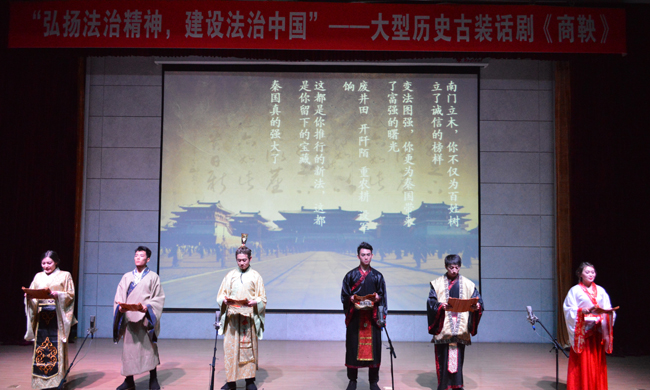 最后,法学院师生创作改编的大型历史古装话剧《商鞅》拉开大幕。同学们用生动的表演深刻诠释了商鞅变法的历史意义,也印证了建设法治国家是我国自古以来的不懈追求。