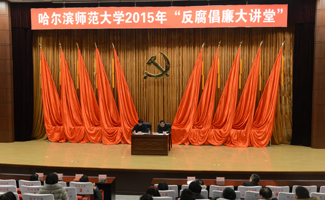 (杨宝君/文)按照省高校纪工委关于在省属本科高校深入开展反腐倡廉大讲堂活动的有关要求,2015年12月29日下午,我校反腐倡廉大讲堂活动在科学会堂举行。学校党政领导、副处级以上干部、学校和学院特邀纪检监察员,辅导员,教工和学生党支部书记,机关全体干部,学院院办和教科办全体人员,系主任和副主任,共计600余人参加了本次活动。活动由党委常委、副校长杨锐锋主持。