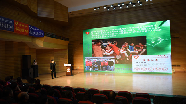 在“青年之声”黑龙江志愿服务联盟和2016年黑龙江省青年志愿者助残“阳光行动”启动仪式上,由王淑滨和孙立军共同为来自不同领域的首批7名“青年之声”黑龙江志愿服务联盟的导师颁发聘书。在随后的青年志愿者主题分享会上,来自人民网黑龙江频道记者杨海全、黑龙江大学朝阳社团成员张悦、哈尔滨嘉仁公益服务发展中心理事长王海臣、东北林业大学研究生支教团代表魏皓天、龙广高校台“帮帮同学会”爱心志愿服务组织代表文凯以及我校自强助困志愿者田园(我校经济学院2014级会计专业专升本学生),分别结合自身的志愿服务经历,分享了他们感人的志愿服务故事。尤其是我校田园同学的事迹分享,更是感动了在场的每一位观众。田园同学从小患先天性脑瘫,虽然饱受病痛折磨,但她却身残志坚、自强不息,在救困自助的同时,积极参与志愿服务和义工活动,服务身影遍布了多个社区、街道、敬老院、儿童福利院等地,事迹生动、催人泪下,收获了现场观众的阵阵掌声。我校也结合田园同学自强助困的典型事迹,成立了一支以田园同学命名的“田园志愿服务队”,旨在通过田园同学身残志坚、自强不息、热衷志愿的精神引领广大青年学子积极投身志愿服务,同时也鼓励更多和她有着类似情况,拥有志愿服务能力的青年,重拾信心,克服困难,投身志愿,在奉献中发现生活的价值,来自文学院的王超等服务队的第一批志愿者代表也参与了分享启动仪式活动。