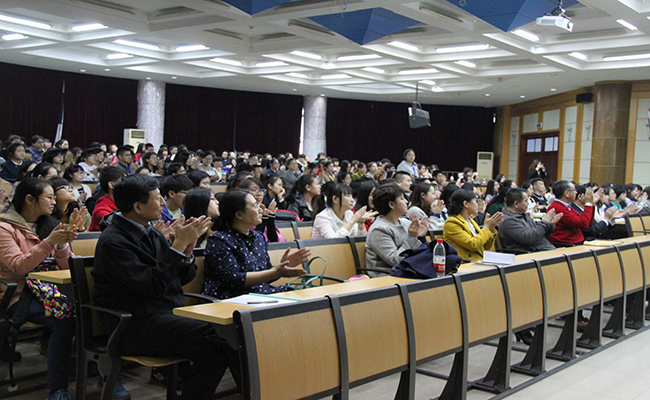 伴随着古琴演奏的悠扬乐曲,中华好诗词欣赏讲座的序幕拉开。倪老师引经据典,通过陈寿、罗贯中、杜甫、陆游、辛弃疾、文天祥等许多名家的诗词作品,从真实的历史与文学作品角度对诸葛亮进行了深入浅出的分析,展现了诸葛亮的雄才大略和蜀相的忠诚。那声声细腻深沉的古诗词之音,一首首大家耳熟能详的诗词名句,感染着在座的每一位喜爱古典诗词的老师和同学们,纷纷情不自禁地与倪老师一起吟诵互动起来,把讲座一次次推向高潮。倪老师通过自身对古诗词的感受、热爱和讲述,激发了师生们学习传承中华经典文化的热情,潜移默化地感染着现场听众。