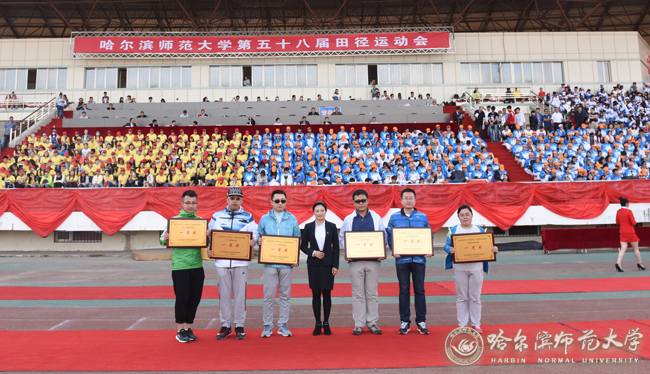 图 党委常委、纪委书记郭加利为获得教工女子、教工男子团体总分前6名的单位颁奖
