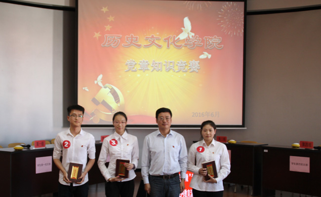 (刘宪辉/文)2016年6月1日,历史文化学院在人文楼516室举行了“学习党章”知识竞赛活动。校党委常委、工会主席赵科学,校党委常委、组织部长刘柏清出席活动并为获奖选手颁奖。历史文化学院150余名教师党员、学生党员观摩了比赛。