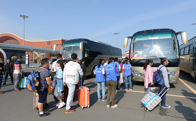 图 新生在火车站乘坐学校迎新车辆去往各个校区
