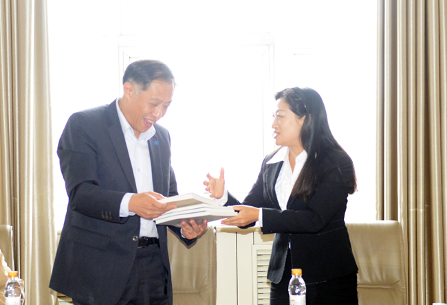 图 党委常委、副校长何晶代表学校将前三届基金资助后已出版的著作赠送给姜跃滨先生