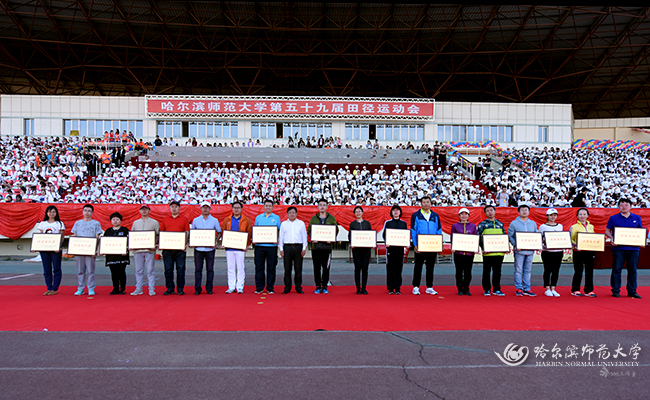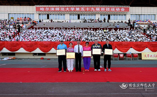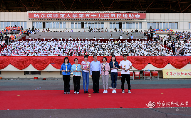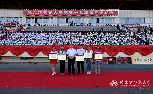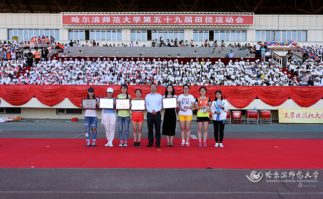 图 党委常委、组织部长刘柏清为获得教工女子团体总分前6名的单位颁奖