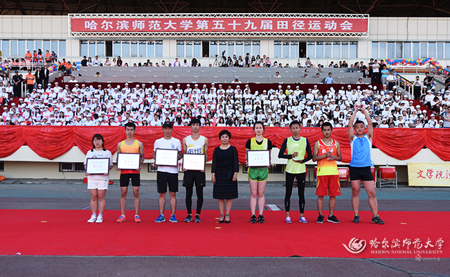 图 党委常委、副校长张喜田为获得学生甲组女子团体总分前8名的单位颁奖