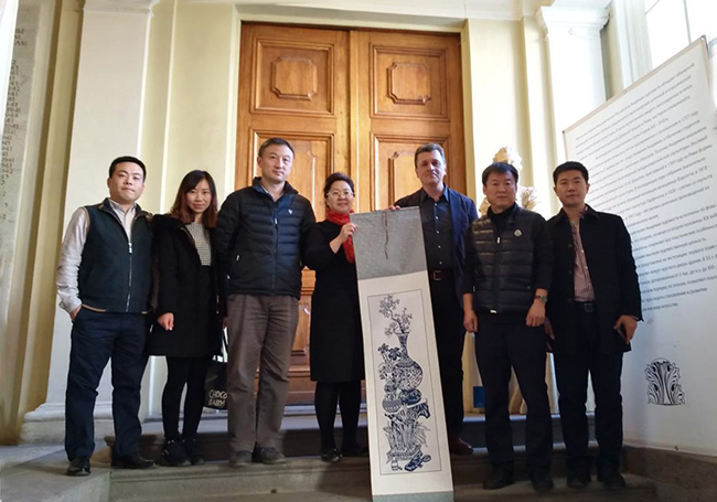 图 党委副书记蒋晶洁代表学校向列宾美术学院赠送我校教师剪纸作品