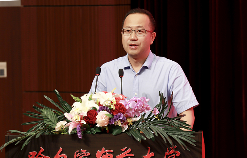 图 校友代表、哈尔滨市第三中学校长、我校92届历史系毕业生王明伟发言