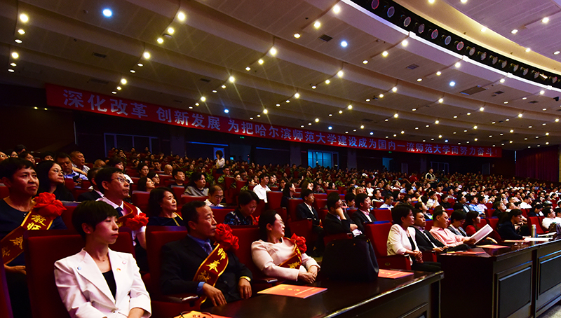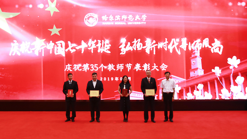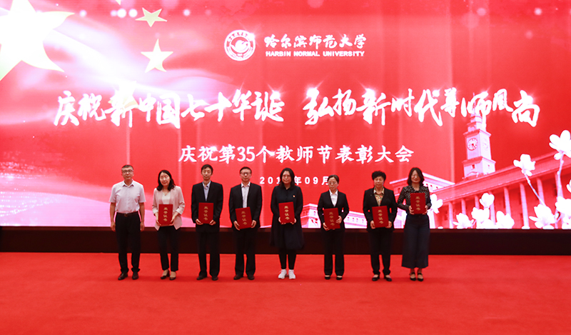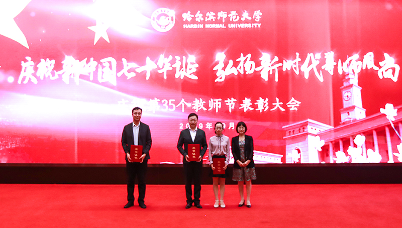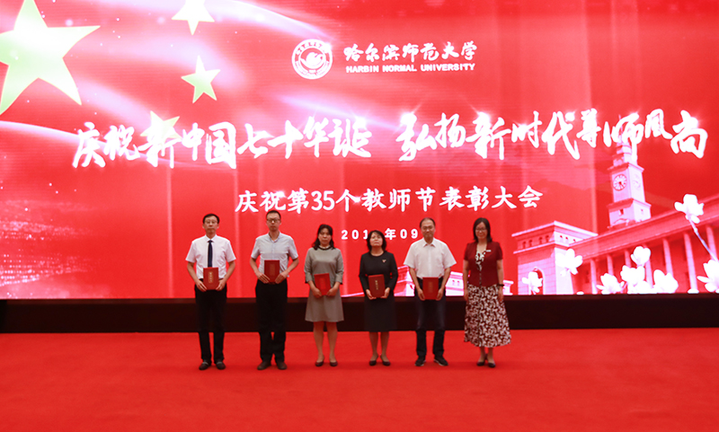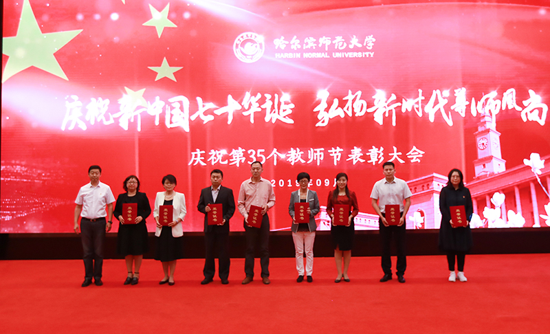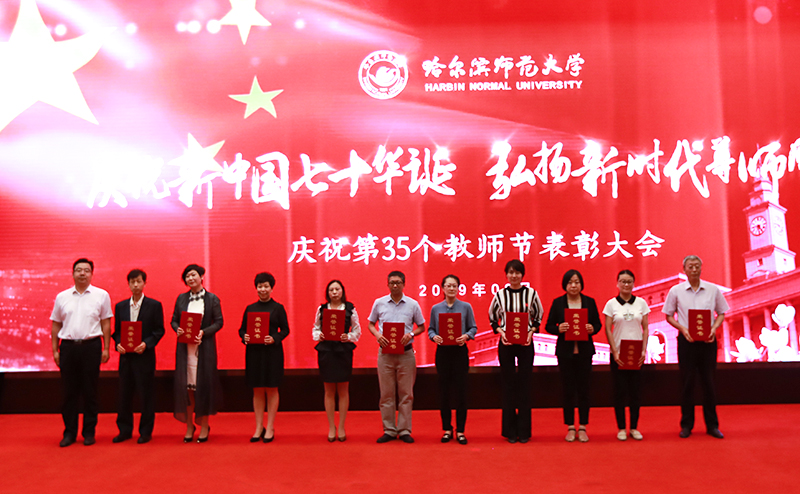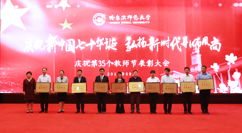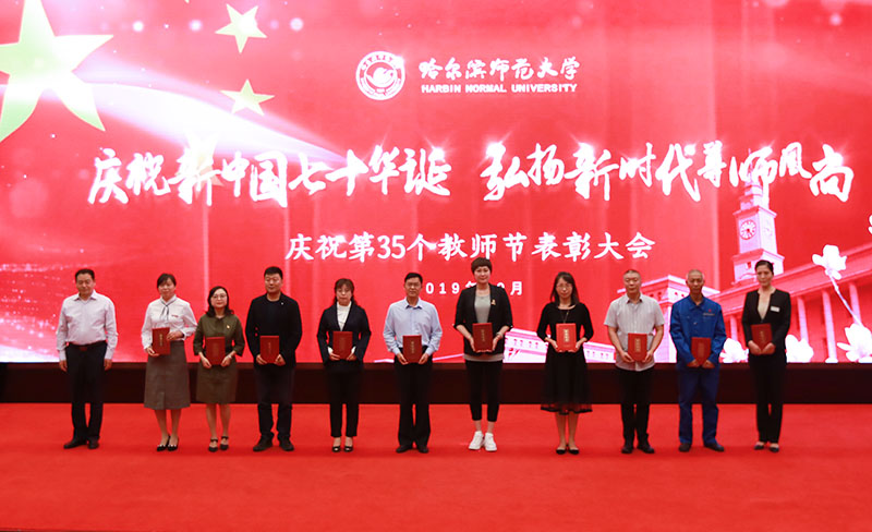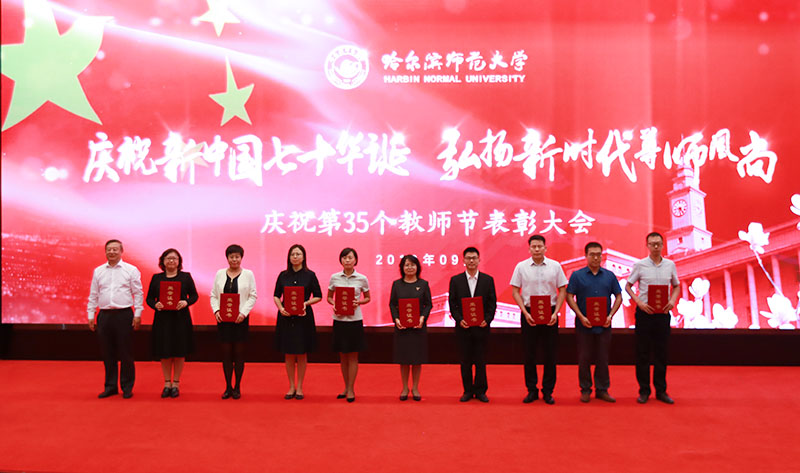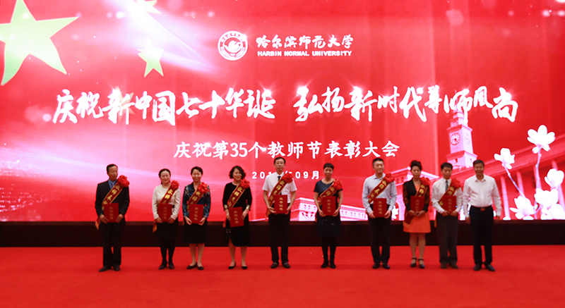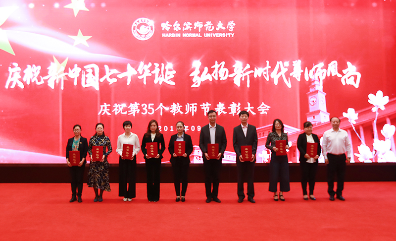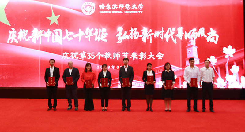 会上,党委副书记杨锐锋宣读获得2019年全国教育系统先进集体、先进工作者,全国优秀教师和第十一届全国高校辅导员年度人物入围奖、黑龙江省辅导员年度人物的获奖单位和教师名单;党委副书记郭砾宣读获得2018年全省高校“年度人物(群体)”,全省高校师德先进集体、先进个人和2019年全省高校师德先进集体的获奖单位和教师名单;副校长臧淑英宣读获得2019年全省模范教师,全省优秀教师的获奖教师名单;党委常委、副校长马明宣读《关于表彰哈尔滨师范大学2018—2019学年度先进集体和先进工作者的决定》;党委常委、副校长张喜田宣读获得2019年国家社会科学基金项目、国家自然科学基金项目和2019年黑龙江省自然科学基金优秀青年项目的获奖教师名单;党委常委、纪委书记郭加利宣读获得2018年黑龙江省第十八届社科奖和黑龙江省科学技术奖的获奖教师名单;党委常委、副校长赵科学宣读获得哈尔滨师范大学第四届教师“奉献奖”和第十二届“教学名师奖”的获奖教师名单;党委常委、工会主席李庆霞宣读获得哈尔滨师范大学第十届“优秀中青年教师教学奖”和2019年“宁齐堃”教学奖的获奖教师名单。伴随着欢快喜庆的乐曲和全场师生热烈的掌声,学校领导为获奖单位和教师代表颁奖。