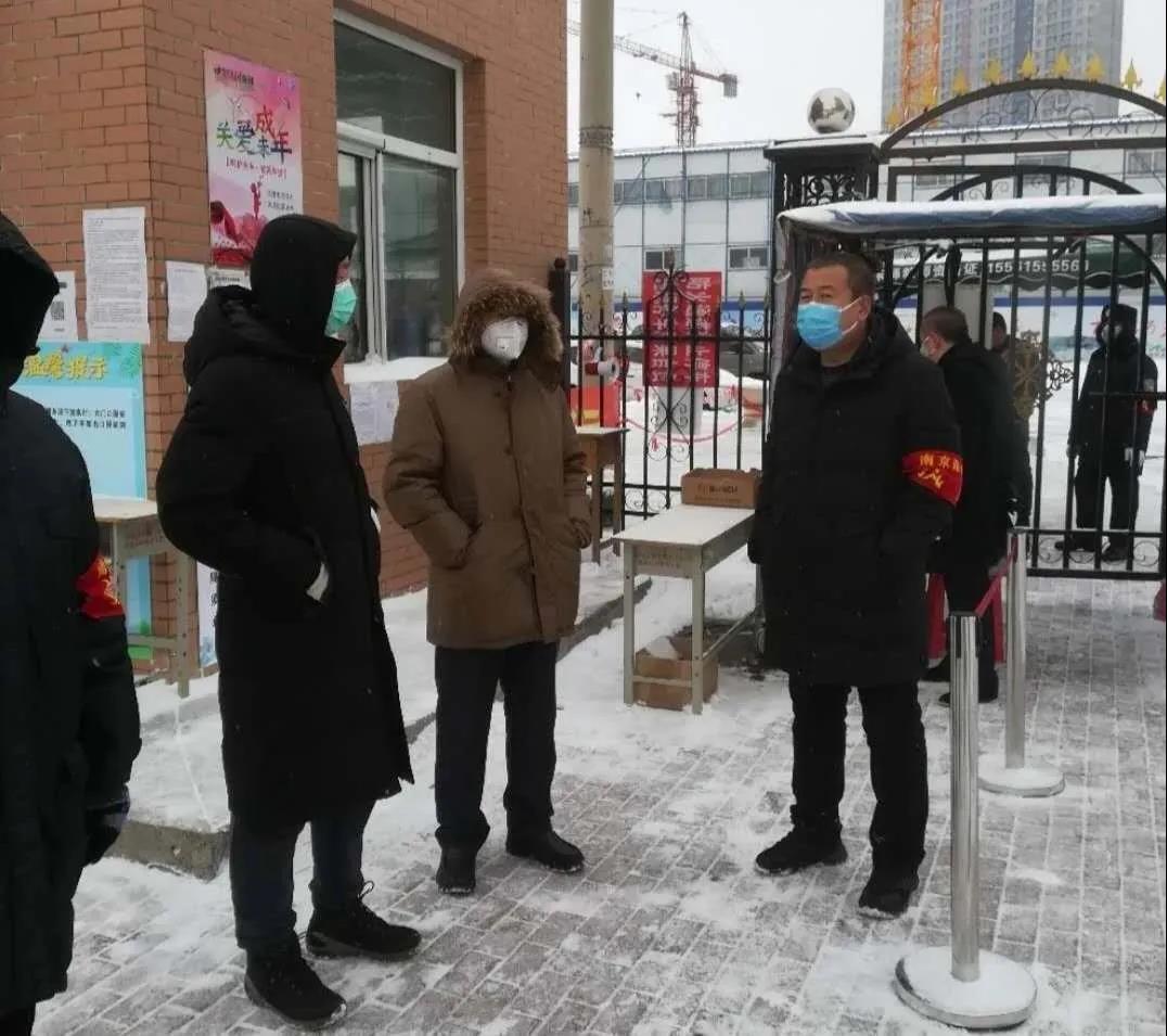 马明首先来到江北家属区门卫室,认真检查了防疫工作记录,向物业管理人员详细询问了家属区居民出门证发放、快递领取、电梯消毒等有关情况。随后,他冒雪实地查看了校园围栏修复情况以及家属区和教学区新设隔离栏施工情况。最后,马明等一行来到物资库,对防疫物资储备、管理及消防安全情况进行了检查。