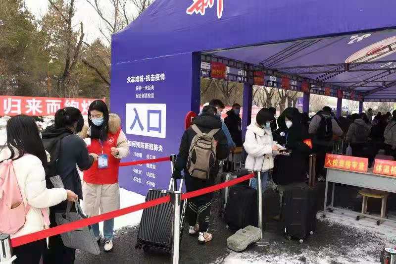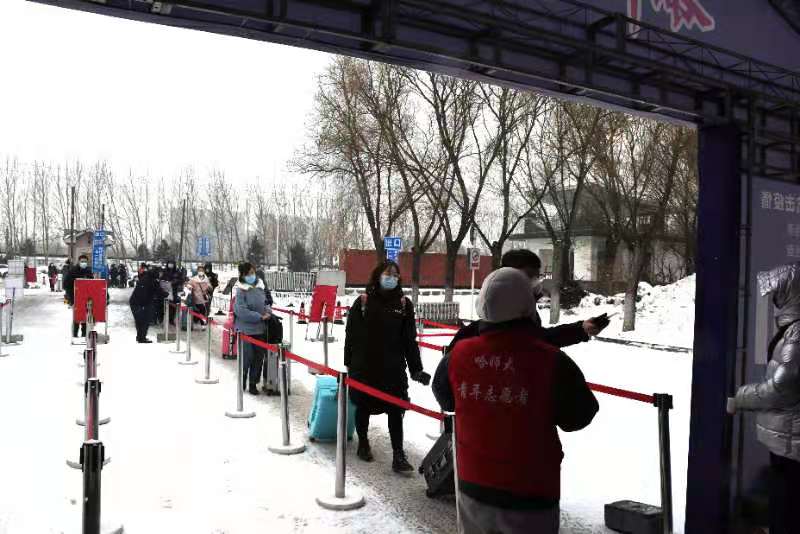 返校第一天,学工战线工作人员早早来到学生返校报到现场,开展工作,迎接学生,把好返校“安全关”。早晨7点开始,陆续有学生到达学校门口,在工作人员的引导下,学生有序进行扫码、测温、行李消杀、身份核验等返校流程。现场的老师和志愿者们不畏寒冷,始终在风雪中坚守各自的工作岗位,履职尽责,为学生做好服务保障工作。