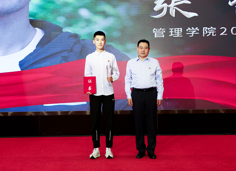 图 党委常委、副校长张喜田为感动校园十佳大学生个人颁发获奖证书和奖杯