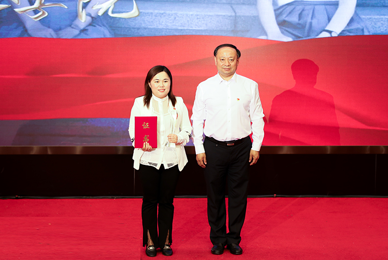 图 党委常委、纪委书记,省监委驻哈尔滨师范大学监察专员郭加利为感动校园十佳大学生个人颁发获奖证书和奖杯