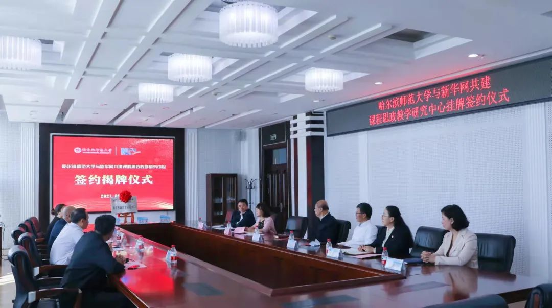 图 校长孙立军与新华网在线教育分公司总经理孟源代表双方共同签署《哈尔滨师范大学与新华网共建课程思政教学研究中心项目框架合作协议》